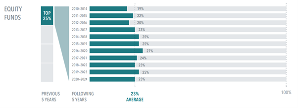 But persistence is the issue. For example, on average only 23% of U.S funds in the top quartile (25%) of previous 5-year returns maintained a top‐quartile ranking in the following 5 years.